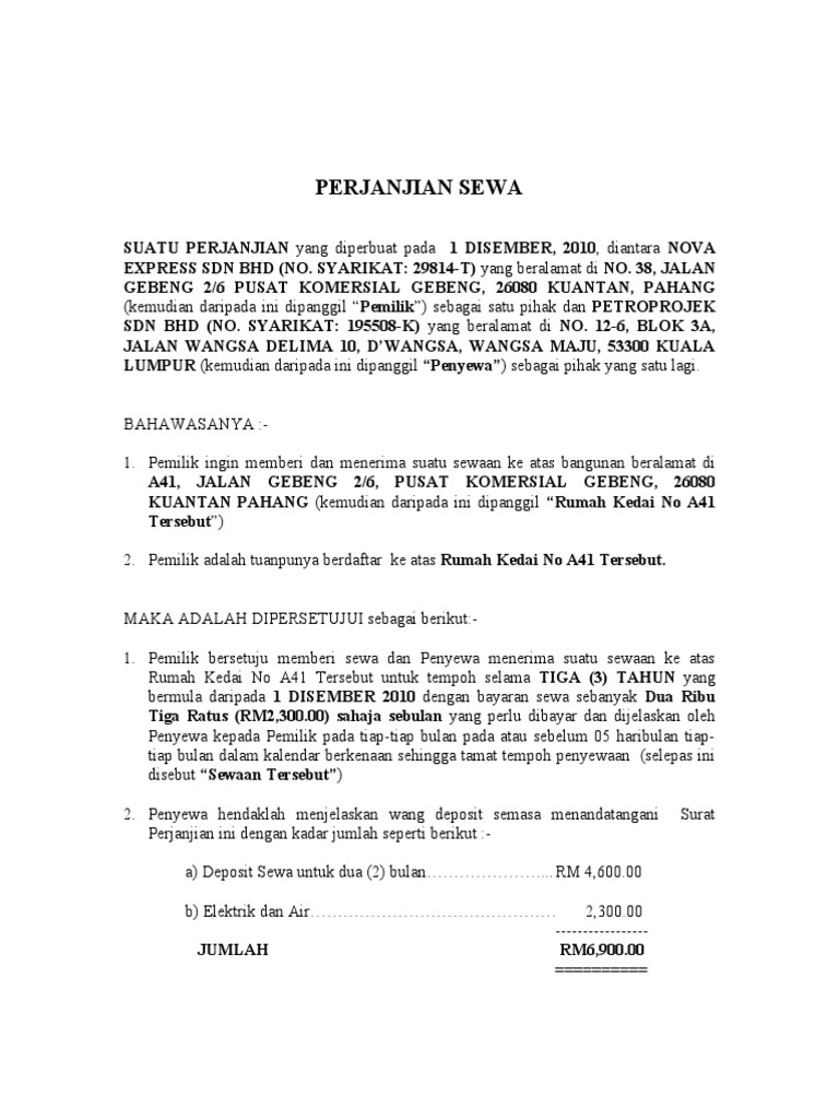 Contoh Surat Perjanjian Sewa Kedai Atau Rumah