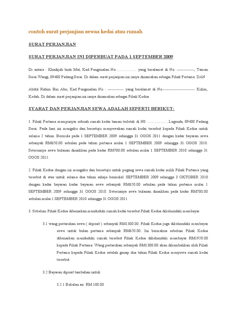 Contoh Surat Perjanjian Sewa Kedai Atau Rumah