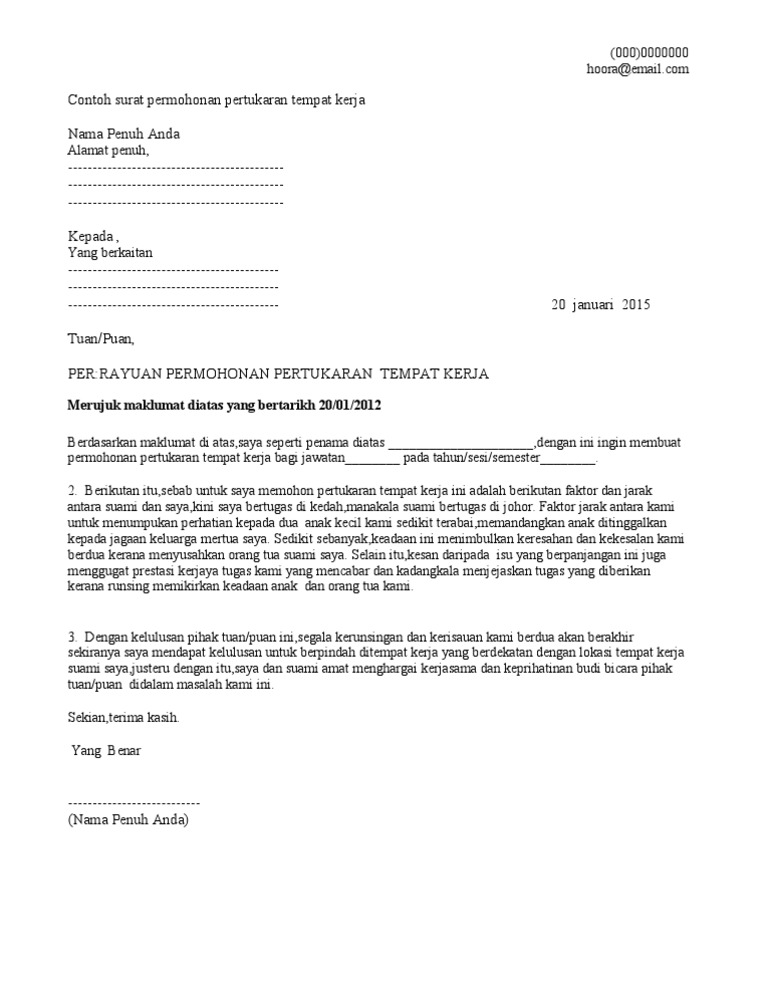 Contoh Surat Permohonan Pertukaran Tempat Kerja Contoh Resume