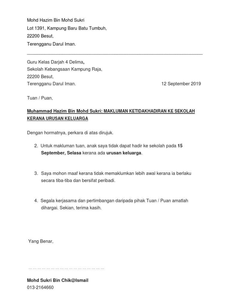 Contoh Surat Tidak Dapat Hadir Ke Sekolah Kerana Urusan Keluarga