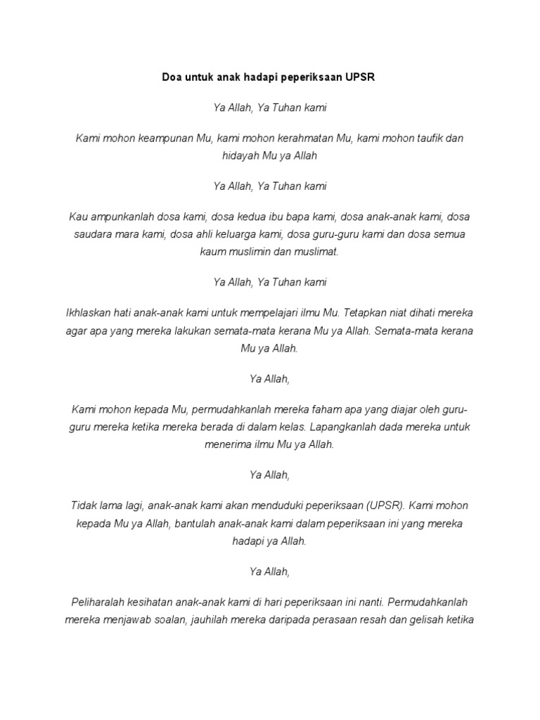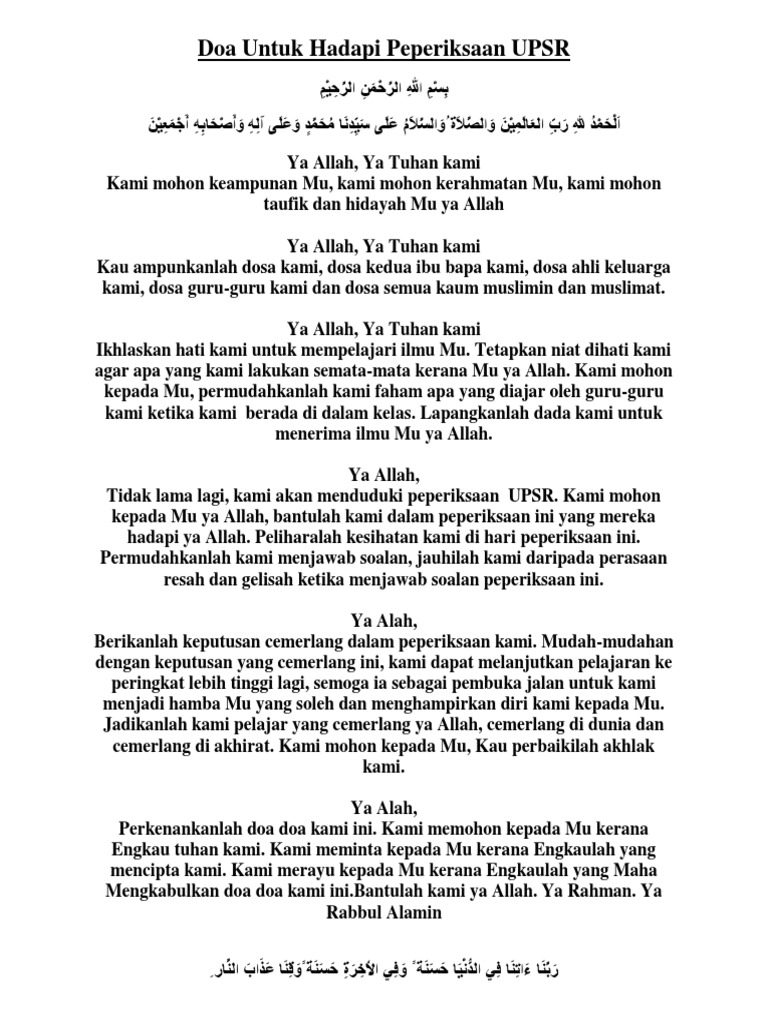 Doa menghadapi peperiksaan upsr. Doa sempena menghadapi peperiksaan upsr. Telah menjadi lumrah dalam kehidupan umat islam untuk berdoa kepada allah swt dalam kehidupan seharian. Doa bukan sahaja salah satu cara untuk meminta agar sesuatu hajat dikabulkan tetapi juga untuk memohon keampunan dan keredhaan daripada allah. Besok akan bermulalah peperiksaan ujian pencapaian sekolah rendah upsr.