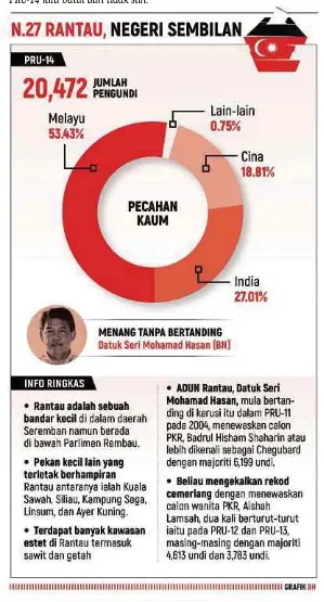 Kronologi petisyen dun rantau. Susulan itu pada 16 september lalu mahkamah tinggi seremban mengisytiharkan kemenangan datuk seri mohamad hasan dari barisan nasional bn bagi kerusi itu. Seremban prk dun rantau yang berlangsung pada 13 april ini bukanlah pilihan raya biasa sebaliknya ia melibatkan maruah calon terutama dr s streram yang dinafikan haknya untuk bertanding pada pru 14 lalu. Klik pautan yang dsertakan untuk melihat senarai calon dan keputusan undi.