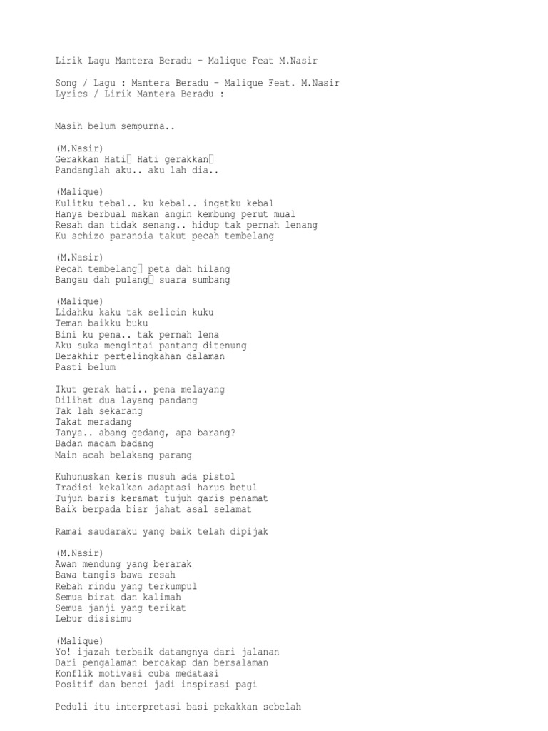 Mantera Beradu Lyrics By Malique Feat M Nasir Masih Belum Sempurna Gerakkan